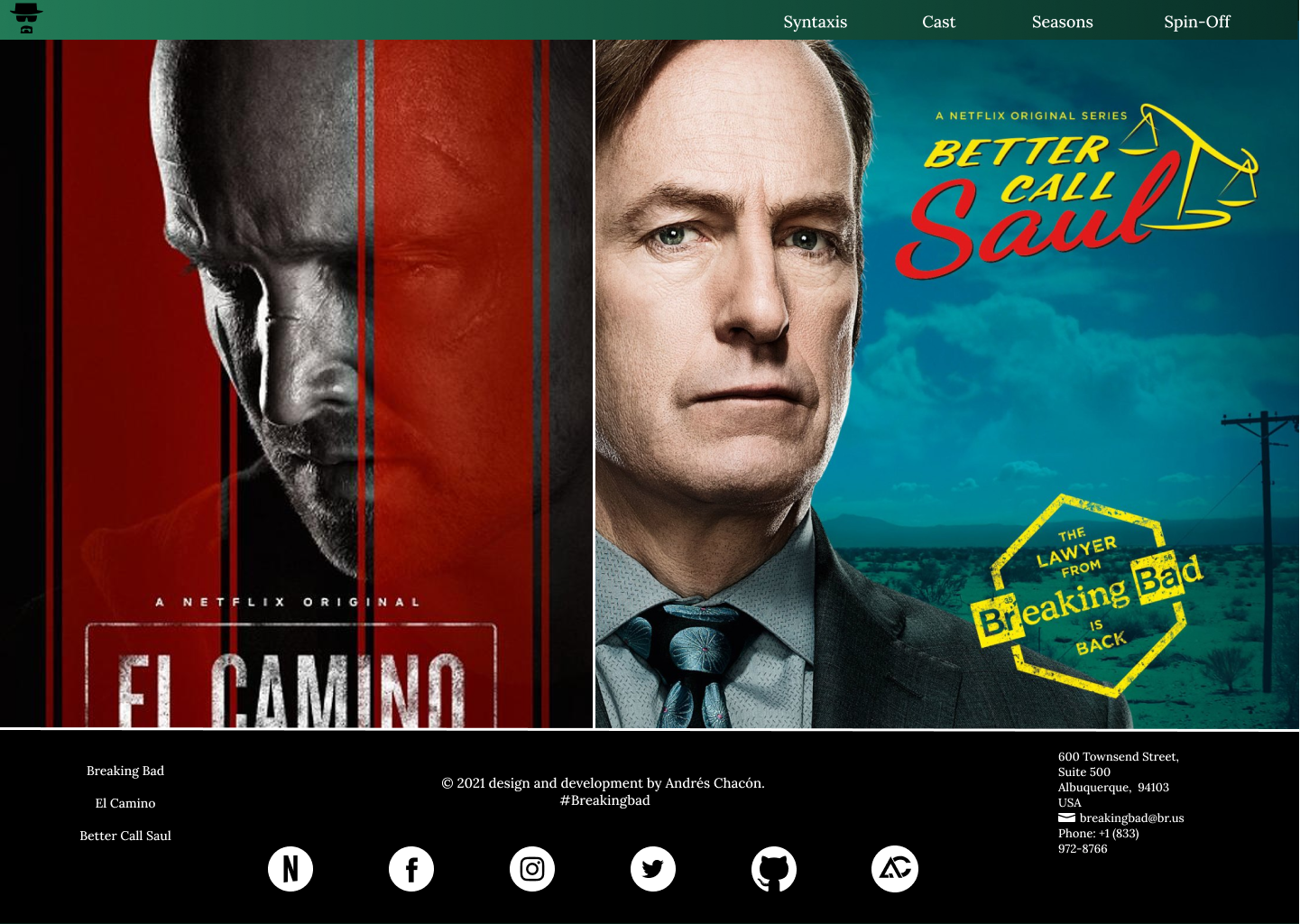 B-bad-css It is a landing page tribute to the iconic US series "Breaking Bad" produced by Vincen Gilligan, on this page a brief synopsis of the general plot of the series is given, the main characters, the seasons are shown and the Spin-off of the same "better call Saul" and "El camino" in addition to the links to the main social networks of the series and the link to view it through the Netflix platform.